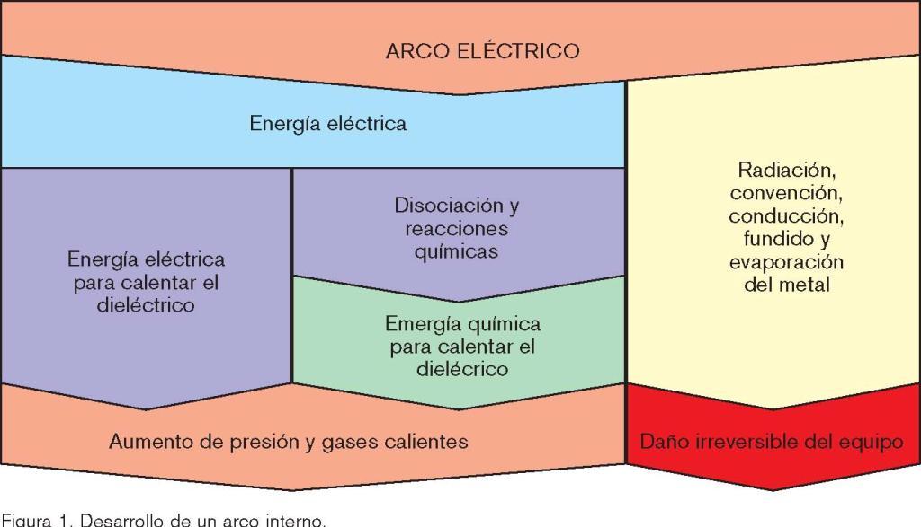 El arco interno es un fenómeno muy rápido, casi explosivo, de transformación de una energía eléctrica inicial en la generación de una onda de presión y calor sobre el medio donde se produce, es decir, típicamente el medio dieléctrico utilizado. En la figura 1 se trata de explicar cuál es su desarrollo.