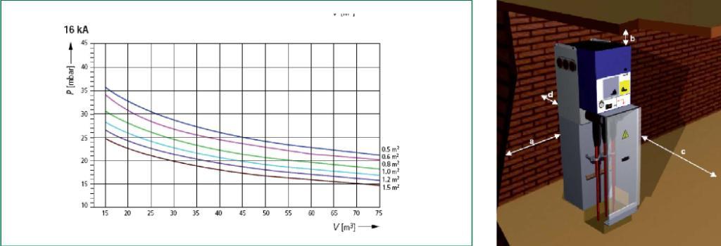 – Conductos de expansión. Adicionalmente a los discos de ruptura se puede disponer en el equipo un conducto que evacue los gases hacia zonas controladas y sin producir ningún daño externo. El conducto puede ser construido como tal o mediante la ubicación de los equipos dentro del local guardando unas determinadas distancias, por ejemplo, el espacio entre una aparamenta bajo envolvente metálica y la pared posterior.