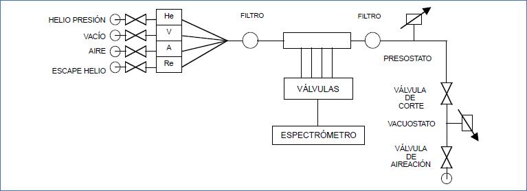 Por un extremo del circuito se comunican presión de helio, vacío, presión de aire (en caso de prueba integral o en modo vacío) y el retorno de helio