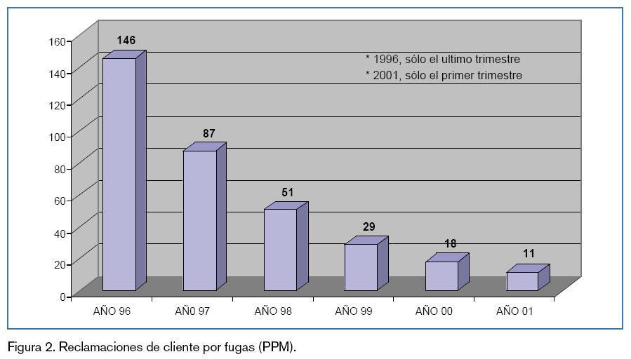 En el año 1998 quedó eliminada la prueba bajo agua. En su lugar, había cuatro bancos de husmeación manual. A lo largo del año 2000, se comenzó la implantación de los bancos de detección integral de fugas, a iniciativa de nuestro cliente Volkswagen. Introdujimos en el primer trimestre de 2001 la prueba de husmeación automática, con sendos ban-cos de 10 y de 40 bar de presión de prueba. Los resultados de la implantación pueden observarse en figura 2.