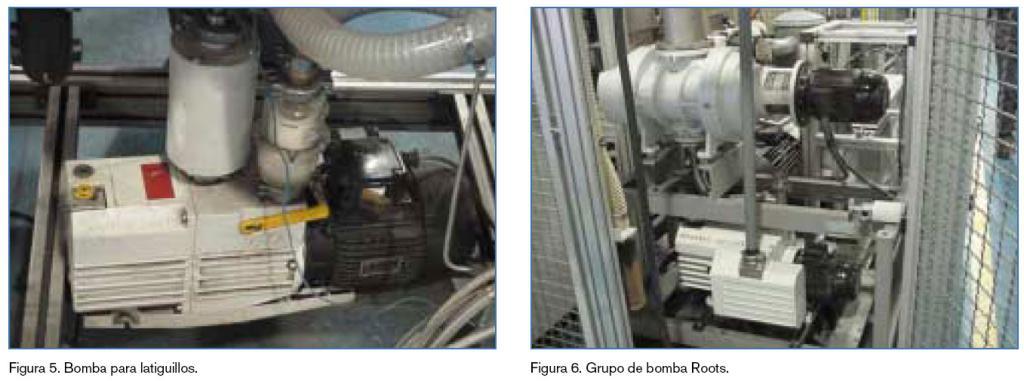 Son dos bombas (figura 6) dispuestas en serie, de 1.000 m3/h de caudal y capaces de rozar el alto vacío. En nuestra aplicación, trabajan contra la cámara de prueba integral tras la bomba rotativa. Se conectan a ella cuando se logran los 6 mbar hasta alcanzar 20.10-3 mbar.