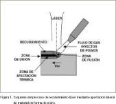 La técnica de recubrimiento por láser consiste, en líneas generales, en fundir polvo metálico con un láser sobre el sustrato dañado que se desea reparar, ver la figura 1. La velocidad de avance del láser añadida al movimiento tridimensional que se puede crear en función de la geometría de la zona dañada permiten crear capas de recubrimiento que regeneran la pieza dañada.
