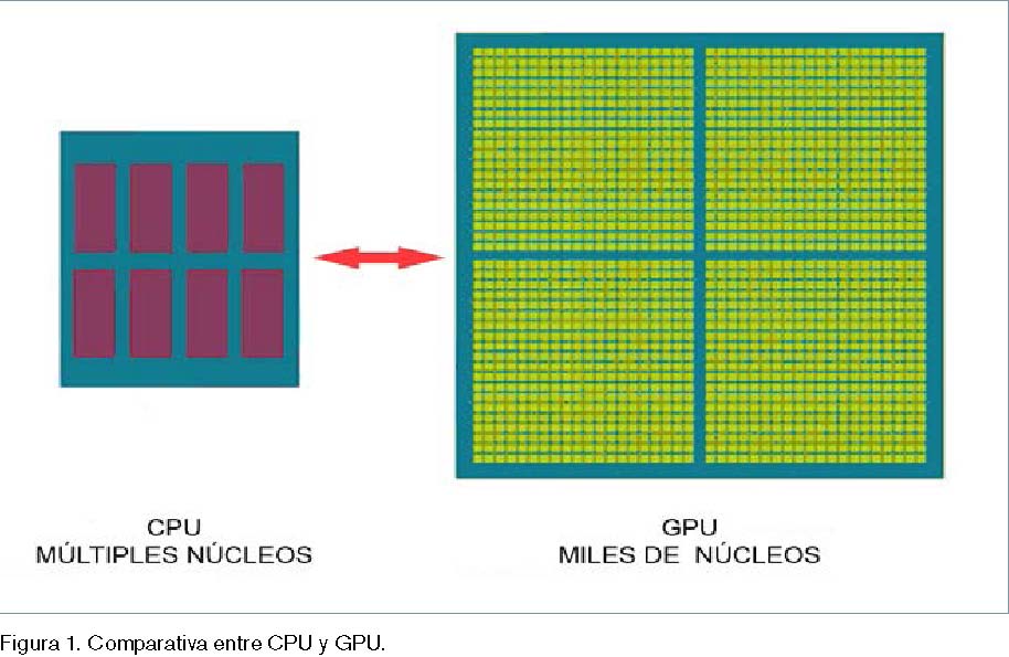 Tradicionalmente, las tarjetas gráficas y sus unidades de procesamiento, llamadas GPU por sus siglas en inglés (Graphic Processing Unit), se han utilizado para la generación de gráficos en videojuegos o simuladores y en tareas de renderizado de secuencias de animación. Sin embargo, los procesadores de las tarjetas gráficas o GPU presentan unas características que hacen muy atractiva su aplicación al cómputo de problemas con un gran número de operaciones y/o procesos iterativos. Del mismo modo que los procesadores de los ordenadores, llamados CPU por sus siglas en inglés (Central Processing Unit), la GPU está encapsulada en un único chip. La principal diferencia entre ambos chips es el número de procesadores y las tareas que desarrollan cada uno de ellos. Una CPU actual dispone habitualmente de 4 u 8 núcleos de proceso (Fig. 1), mientras que una GPU dispone de cientos o miles de núcleos de proceso. No obstante, los núcleos de la GPU realizan tareas más sencillas que los de la CPU. Mientras que los núcleos de la CPU se optimizan para ejecutar tareas de manera secuencial, los núcleos de la GPU se disponen con una arquitectura paralela que permite realizar varias