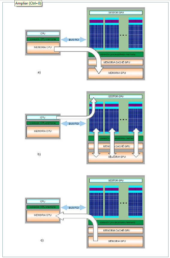 La generación de gráficos en los ordenadores actuales puede realizarse de dos formas: mediante una tarjeta gráfica integrada en la CPU (lo cual limita los recursos de la CPU), o mediante una tarjeta gráfica dedicada que cuenta con su correspondiente GPU (es el caso que nos concierne en este trabajo). Por tanto, la CPU y la GPU son dos elementos físicos distintos, cada uno con una memoria asociada, que se comunican mediante un bus (del tipo PCI Express actualmente). Con esta disposición, si se desea ejecutar tareas en la GPU y aprovechar sus capacidades de cálculo, el primer paso que hay que realizar es introducir los datos a través de la CPU y copiarlos posteriormente a la GPU. Este proceso se ilustra en la figura 2A. A continuación, se envían las instrucciones de ejecución al gestor de la GPU, que se encarga de distribuir y ejecutar las tareas entre los múltiples procesadores de la GPU (fig. 2b). El último paso consiste en copiar los resultados de la GPU a la CPU para poder trabajar con ellos (fig. 2c). El principal inconveniente de esta tecnología es, precisamente, la transferencia de datos entre las memorias de los dos chips, pues el bus PCI Express que los conecta es mucho más lento que los buses que conectan cada uno de los chips con sus respectivas memorias. Se trata, además, de un cuello de botella que no se puede evitar.