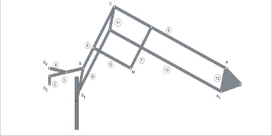 El movimiento de lazo es una inestabilidad inherente al ferrocarril, por lo que controlarlo es un aspecto fundamental para garantizar la estabilidad de los vehículos ferroviarios y la comodidad de los pasajeros. En este trabajo se propone el dispositivo de la figura 3 como posible mecanismo para controlar el movimiento de lazo. Se compone de tres mecanismos fundamentales: uno de generación (basado en el mecanismo de Chebyshev y que comprende las barras 1, 2, 3 y 4), otro de pantógrafo (barras 5, 6, 7 y 8) y otro de refuerzo (formado por el resto de eslabones). Sus dimensiones se recogen en la tabla 2.