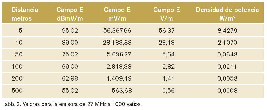 Si la emisora fuese de 1000 vatios de potencia, los valores obtenidos serían lOS representados en la tabla 2.