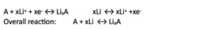 – Lithium-ion batteries: non-aqueous electrolytes (aprotic) or lithium salt due to the thermodynamic instability of lithium; mixed oxides (Co, Ni, Mn, …) or metallic sulphides with Li in cathodes and Li or carbon-Li materials for anodes. Complex reactions depending on the materials used, summarized below: