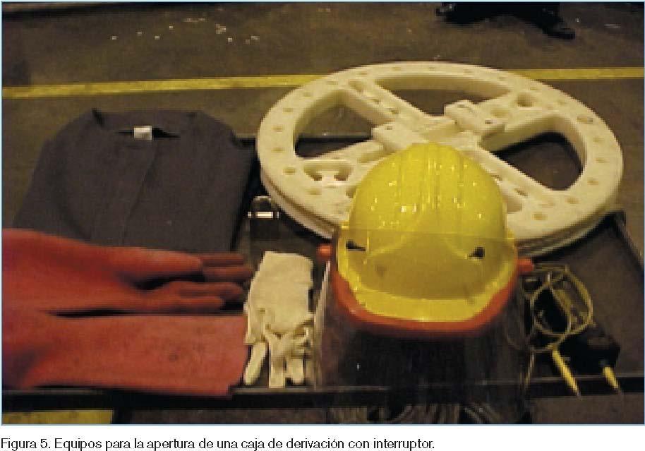 • Los trabajos con cajas de derivación deben requerir siempre la presencia de 2 personas como mínimo, llevando medios para comunicarse con los servicios de asistencia (teléfono móvil, walky, etc.). Además en cada grupo de trabajo se deben llevar 2 equipos completos de equipos de protección individual (guantes aislantes, guantes de algodón, guantes de protección, zapatos de seguridad, casco aislante con pantalla facial y chaqueta ignífuga para electricista). (ver figura 5)