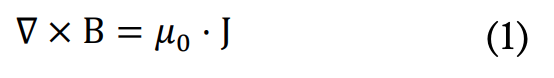 1. Si por un elemento conductor (elemento 1, primario, bobina en este caso) circula una corriente eléctrica, esta induce un campo magnético en la región (ley de Ampere). Si se trata de una corriente alterna la que circula por el conductor, el campo magnético obtenido es también alterno, es decir, variable en el tiempo. Esta ley se define teóricamente mediante la ecuación diferencial (1), que indica que la circulación de corriente eléctrica por un conductor (por ejemplo, un alambre de cobre) provoca la aparición de un campo magnético “B” rotacional alrededor del alambre, y que el rotor del campo magnético apunta en el mismo sentido que la densidad de corriente “J”. En dicha fórmula se incluye el valor de la constante magnética “?0”, también denominada permeabilidad magnética en el vacío, cuyo valor es 4?·10-7 H/m.