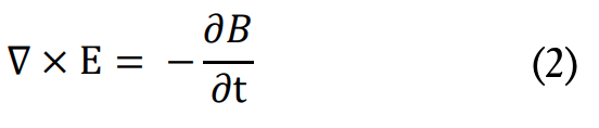 2. Si en la región de un campo magnético variable se encuentra expuesto un objeto (elemento 2, secundario, barras de acero en este caso) ferromagnético y conductor, se induce en él una fuerza electromotriz (f.e.m.) que implica que por este elemento circule una corriente eléctrica (ley de Faraday). Dicho de otra manera, el movimiento relativo entre el material y el campo magnético variable causa que los portadores de carga del material conductor se vean sometidos a una fuerza (f.e.m.) y el movimiento de estas cargas genera una corriente eléctrica inducida dentro del conductor. La corriente inducida en el elemento 2 se denomina “corriente de Foucault”, en inglés Eddy currents. Estas corrientes circulares crean electroimanes con campos magnéticos que se oponen al efecto del campo magnético aplicado (ley de Lenz). Teóricamente, la ley se define mediante la ecuación (2), que indica que el rotacional de un campo eléctrico “E” es proporcional a la variación del campo magnético “B” en el tiempo, incluyendo el signo negativo argumentado mediante la ley de Lenz.