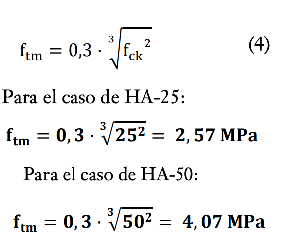 La resistencia media a tracción “ftm” (MPa) se obtiene a partir de la ecuación (4), siendo “fck” (MPa) la resistencia característica a compresión del hormigón a los 28 dÍas.