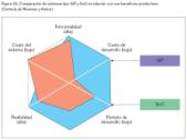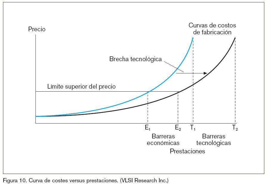 La figura 10 muestra la curva de costes de producción de un circuito integrado mediante un proceso (curva azul) u otro (curva negra). Cada curva se asocia a un proceso de fabricación distinto. En cada caso, existen barreras tecnológicas (puntos T1 y T2) donde un pequeño aumento de prestaciones (u horas de funcionamiento) se consigue únicamente mediante un costo enorme (crecimiento exponencial de las curvas). Por otro lado, las barreras económicas (puntos E1 y E2), marcadas por el precio máximo que el cliente es capaz de admitir, se dan generalmente antes de que se presenten las barreras tecnológicas.