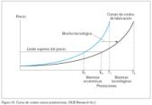 Así, cuando en un proceso (curva azul) se presenta una barrera económica (punto E1) antes de su correspondiente barrera tecnológica (punto T1) es necesario introducir una brecha tecnológica que permita un nuevo proceso de fabricación capaz de desplazar la curva de costos (azul) a una nueva zona (curva negra) donde a igualdad de precio máximo se pueda conseguir un aumento importante de prestaciones o, lo que es equivalente, que manteniendo prestaciones se disminuya el precio.
