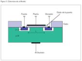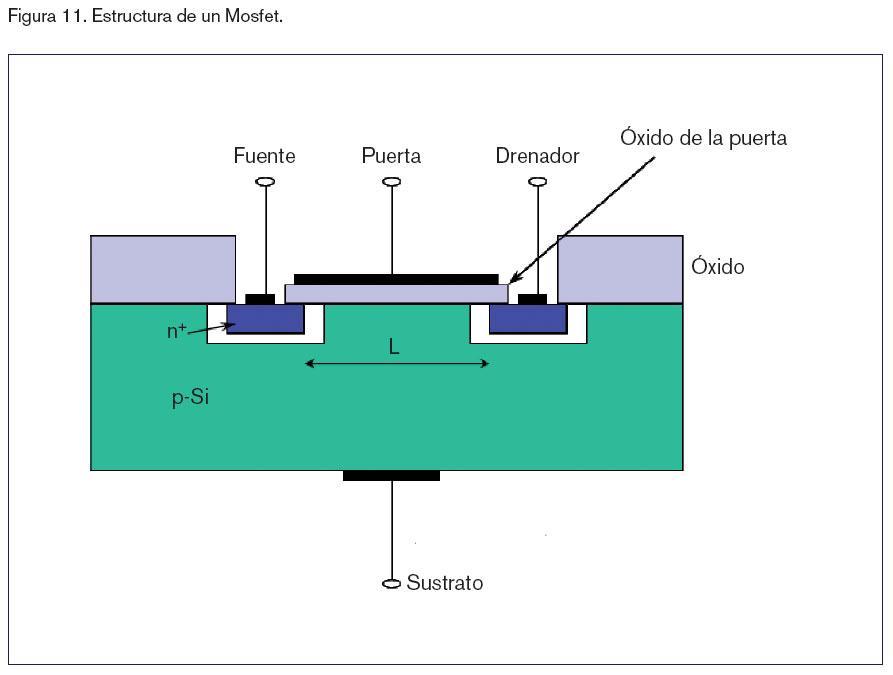 Conforme crece la densidad de integración, en las denominadas tecnologías LSI (Large-Scale Integration, integración a gran escala) y VLSI (Very Large-Scale Integration, integración a muy gran escala), cobra gran importancia la utilización de dispositivos Mosfet (transisto-res de efecto de campo de semiconductor, metal y óxido), debido a su pequeño tamaño, bajos costos de fabricación y baja disipación de potencia. La figura 11 muestra una sección transversal de uno de estos transistores, de utilización en microprocesadores, chips de comunicaciones, memorias y otros sistemas.