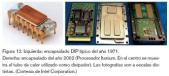 Físicamente, un encapsulado (o paquete, package en inglés) no es más que el soporte físico que actúa de interfaz entre la pastilla semiconductora del circuito integrado (junto con su portador, figura 7) y el cableado impreso (PCB, Printed Circuit Board) sobre el cual se monta (figura 12). De hecho, un chip es inútil sin su encapsulado, ya que el mismo