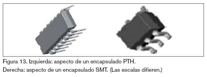 - PTH. Pin-Trhough-Hole (Pin a través de agujero), sistema que permite insertar los pins del encapsulado en el PCB a través de un agujero, uniéndolos al mismo mediante soldaduras realizadas o bien en el lado opuesto al de inserción del CI o bien en ambos lados del PCB.(figura 13).