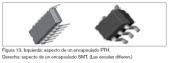 - SMT. Surface-Mount Technology (Tecnología de montaje superficial), sistema que permite la soldadura directa de los pins del encapsulado en la misma cara del PCB donde reposa el CI (figura 13). Este método es muy ventajoso respecto al PTH ya que permite la ausencia de agujeros en el PCB para la inserción de los chips, lo que aumenta la facilidad en la fabricación, y permite colocar componentes en las dos caras del PCB, lo que se traduce en unas dimensiones menores, disminución de componentes parásitos y aumento en la densidad del cableado impreso.