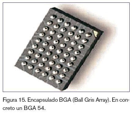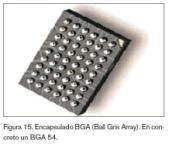 Todos los encapsulados anteriormente citados responden a una necesidad tecnológica de integrar una única pastilla semiconductora. No obstante, el aumento de la densidad de integración y la necesidad de utilizar dispositivos más complejos hacen que, últimamente, se desarrollen otros tipos de encapsulados que permitan acoger estas necesidades crecientes. Quizá, entre todos ellos, destaque el denominado BGA (Ball Grid Array, de traducción similar a “bolas dispuestas en rejilla”), de aspecto indicado en la figura 15.