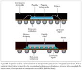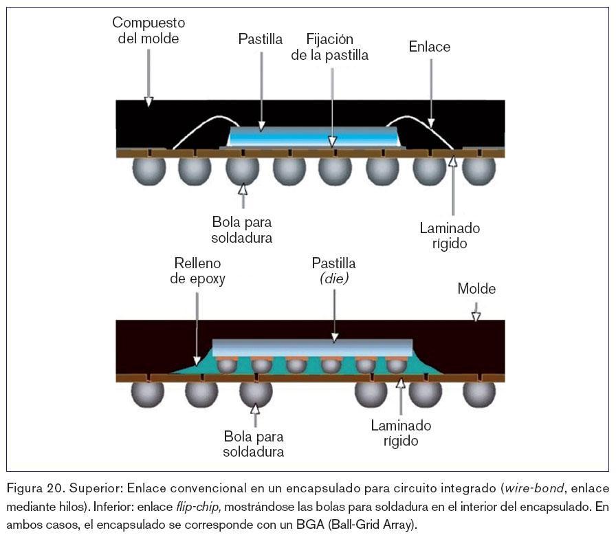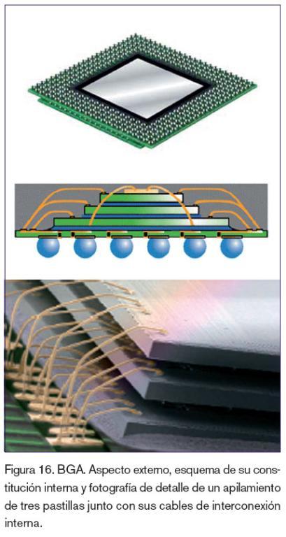 La figura 16 muestra un encapsulado BGA, con el grafismo de su construcción y una microfotografía de un circuito concreto (cortesía de Intel Corporation), en el caso concreto que las pastillas se conecten internamente mediante cables conductores (wire-bonded).