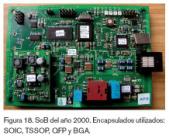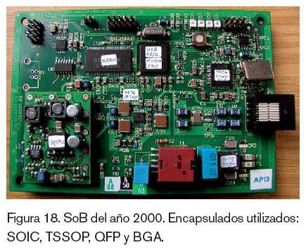 De esta forma, con la introducción de encapsulados avanzados como el BGA, se ha podido aumentar la densidad de integración de los sistemas electrónicos. La figura 17 muestra una placa base de un sistema microcomputador del año 1981 (considerado por aquel entonces de alta densidad), mientras que la figura 18 muestra la placa de un sistema electrónico de comunicaciones, del año 2000, considerado de baja densidad. La diferencia salta a la vista en estos dos casos de los que se denominan SoB (System-on-Board, sistemas en placa).