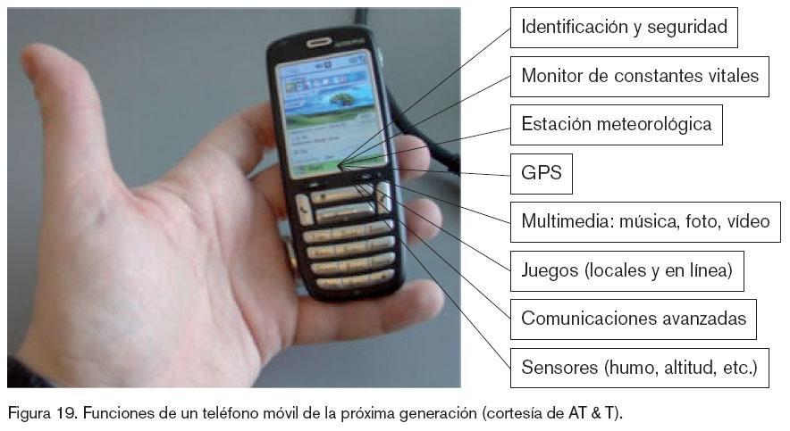 La electrónica de consumo, sobre todo en lo que se refiere a equipos portables, impone, cada vez más, restricciones en cuanto a tamaño, peso y consumo de los sistemas comerciales que, a su vez, han de incorporar cada vez más funciones. La figura 19 muestra las funciones que puede incorporar un teléfono móvil de la siguiente generación de estos dispositivos.