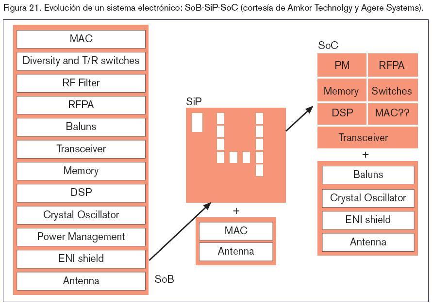 La figura 21, cortesía de Agere Systems y de Amkor Technology, muestra la tendencia evolutiva de los sistemas electrónicos en el caso concreto de un sistema de comunicaciones inalámbrico (Wi-Fi).