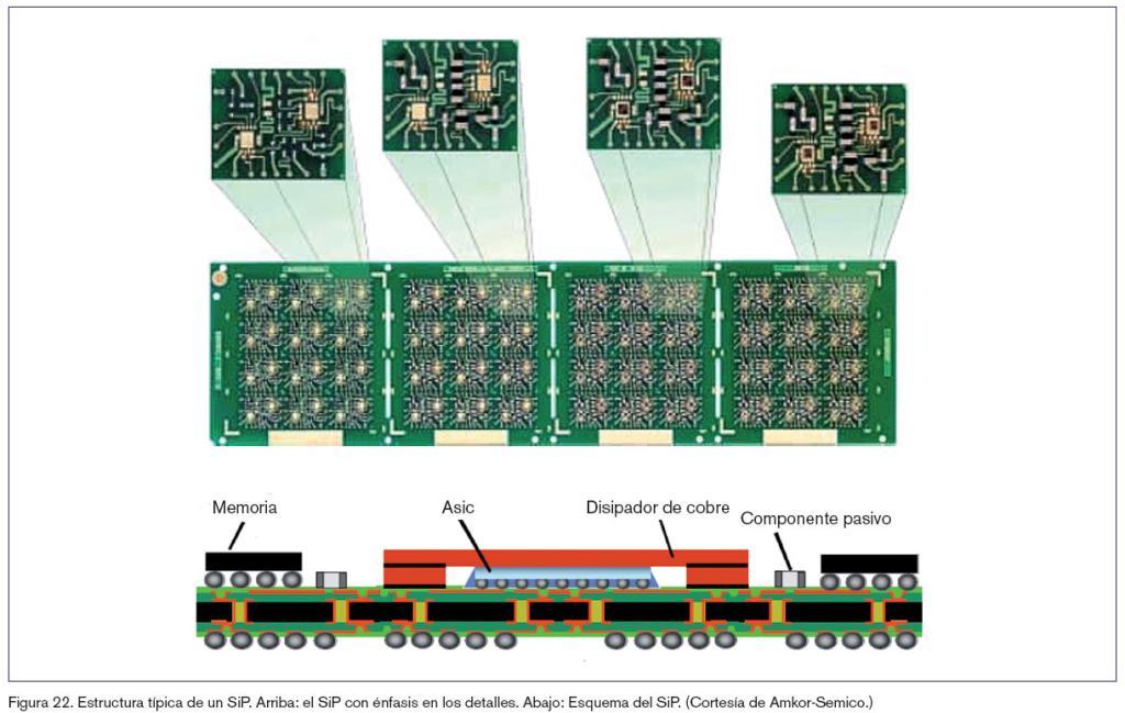 De hecho, algunos SiP actuales incluyen algún SoC (figura 22), permitiéndose, así, que las funciones que sean fácilmente integrables se implementen mediante SoC y éstos formen parte del SiP, siendo ésta la base tecnológica actual que ha de permitir, en un futuro próximo, la sustitución de estos SiP por SoC como eje para cumplir con la aun vigente ley de Moore.
