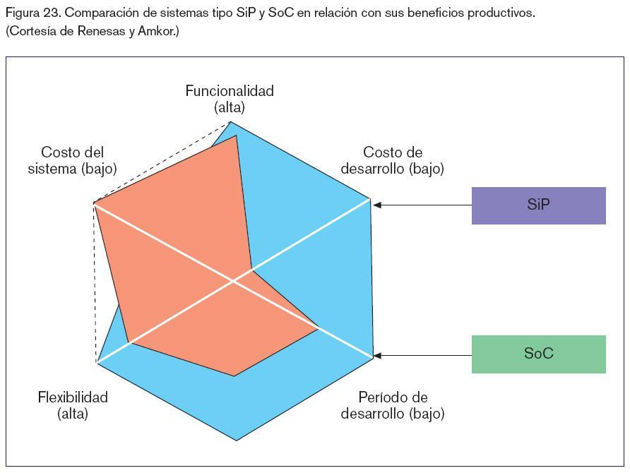 La tecnología actual queda resumida en la figura 23 (cortesía de Amkor-Semico) que muestra que las tecnologías SiP y SoC no son mutuamente excluyentes, y que cada una introduce diversos beneficios: