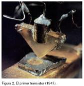 En el año 1947, los ingenieros de los laboratorios Bell, John Bardeen, Walter Brattain y William Shockley desarrollaron el dispositivo denominado transistor (acrónimo de TRANSfer resISTOR) de puntas de contacto (figura 2), un componente capaz de cambiar su característica resistiva en función de la corriente inyectada a su electrodo de control.