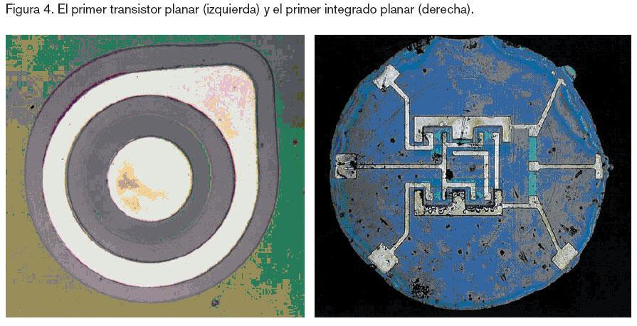 Casi al mismo tiempo que Killby desarrollaba el circuito integrado, Jean Hoerni, de Fairchild, en 1959, desarrolló el primer transistor planar de silicio (figura 4), hecho que permitió a esta empresa desarrollar, en el año 1961, el primer circuito integrado planar (un biestable set-reset, figura 4), base de la actual electrónica integrada (microelectrónica), a partir del cual esta empresa comercializó el primer circuito integrado producido masivamente en 1963: el 709, un dispositivo de dos puertas lógicas con cuatro transistores y cuatro resistores cada una de ellas, hito que se considera el inicio de la integración comercial en la que se ha denominado SSI: Small-Scale integration, Integración a pequeña escala.