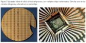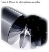 Actualmente, la fabricación de circuitos integrados (CI) o chips, se realiza, mayoritariamente, a partir de una base semiconductora de silicio. Dicha base se obtiene procesando el silicio en bloques cilíndricos, hasta obtener una oblea circular de entre 25 µm y 300 µm, y un grosor de entre 200 mm y 800 mm (figura 5) extraordinariamente pulida y con muy pocas impurezas.