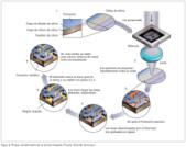 A partir de la oblea primaria, la fabricación del CI se realiza mediante un proceso cíclico de pasos, esquematizado en la figura 6, los cuales se pueden realizar hasta 20 veces, de forma que es posible fabricar muchos circuitos integrados a partir de una única oblea de silicio, a la cual se ha aplicado una capa sensible a la luz o fotoresist (1). Cada ciclo comienza con un patrón determinado, que se proyecta repetidamente sobre la oblea (2). En cada zona donde se proyecta la imagen, se producirá un chip. Se quita la capa fotosensible (3), y las áreas expuestas a la luz ultravioleta se graban al aguafuerte mediante un ataque por gases (4). Estas áreas se bombardean posteriormente con iones (proceso denominado dopaje), creando los diversos transistores y otros dispositivos que forman parte del CI (5). Dichos componentes se interconectan entre sí, mientras que en los ciclos sucesivos se agregan capas de metal y de aislante (6) hasta completar el diseño del circuito integrado.