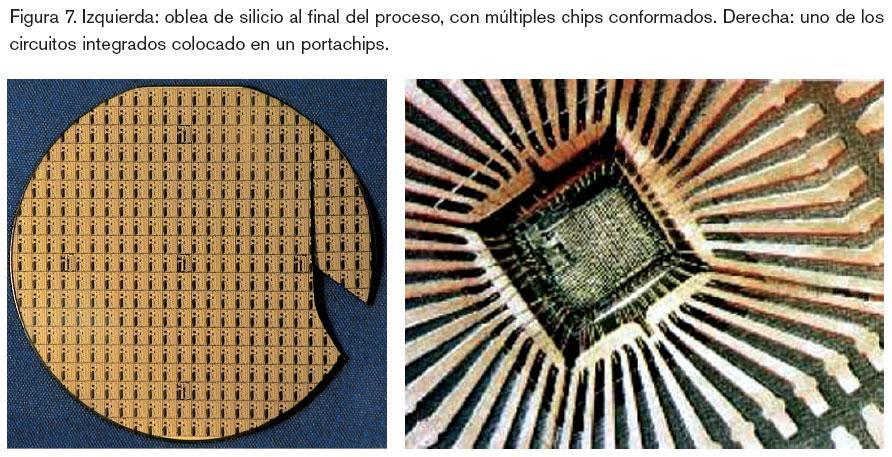 El resultado final es que de la oblea inicial se obtiene una oblea con los chips conformados (figura 7a), los cuales se cor-tan de la oblea formando los denominados dados (en inglés die) o pastillas para, seguidamente, colocarlos en un portador de CI (carrier) o portachip (figura 7) que permitirá el posterior encapsulado