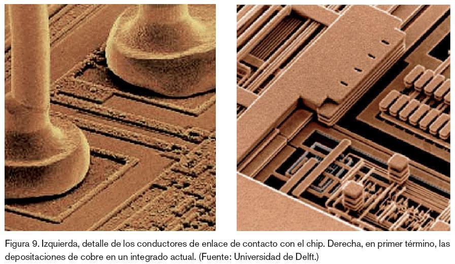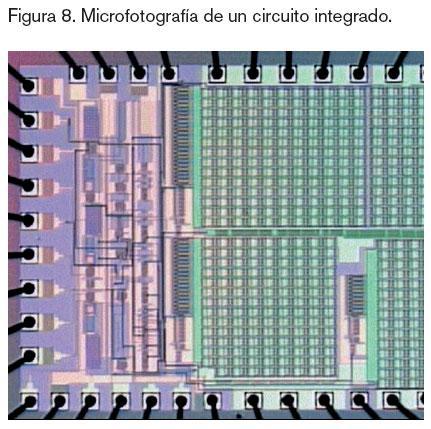El resultado final puede ser, en algunas ocasiones, realmente sorprendente. A título de ejemplo, para constatar esta afirmación y observar los niveles de proceso que se pueden obtener, se presenta, en la figura 8, un circuito integrado correspondiente a un convertidor de continua-continua realizado en tecnología de 0,5 mm, mientras que en la figura 9 se muestra el detalle de las conexiones externas y de las depositaciones de cobre que las permiten.
