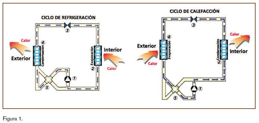 El funcionamiento de la bomba de calor aire-aire (se extrae calor del aire para cederlo al aire) es similar al de un aparato convencional de aire acondicionado. Un compresor aumenta la presión del gas refrigerante. Este gas a alta presión se dirige hacia un batería (condensador), donde se licúa y cede su calor latente de condensación a una corriente de aire forzada mediante un ventilador. Seguidamente, el líquido refrigerante pasa por una válvula de expansión donde disminuye su presión, llegando a evaporarse de nuevo una pequeña parte del mismo. El líquido a baja presión se dirige a otra batería (evaporador) donde pasa a estado gaseoso y absorbe su calor latente de vaporización de otra corriente de aire generada por un ventilador. Así, en una zona de la bomba de calor hay una corriente de aire que se enfría y en la otra parte hay una corriente que se calienta. La incorporación de una válvula de 4 vías entre el compresor y uno de los dos intercambiadores permite invertir el sentido de flujo del fluido refrigerante. Esto significa que cualquiera de las dos baterías puede actuar como condensador o evaporador, permitiendo introducir aire caliente o frío de manera independiente al interior del recinto. Se puede apreciar el funcionamiento de la bomba de calor en la figura 1.