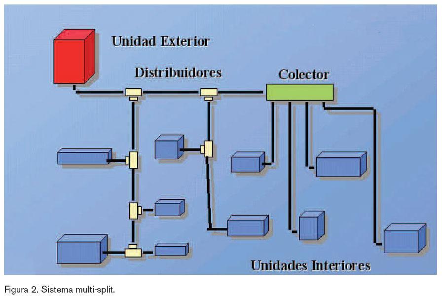Los sistemas VRV de acondicionamiento de aire han resultado de la evolución de los sistemas «Multi-Split». Son sistemas de bomba térmica reversible que permiten conectar varias unidades interiores con una sola unidad exterior a través de dos tuberías de cobre por donde circula el fluido refrigerante (figura 2).