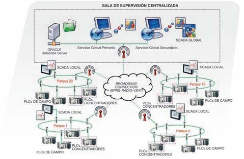 El sistema cuenta con un despacho de producción que permite al promotor conocer la producción de todos y cada uno de los parques en tiempo real, supervisar alarmas y obtener informes. También cuenta con puestos de control locales distribuidos en cada parque que facilitan la gestión y el mantenimiento. Este sistema gestiona uno de los proyectos de energía solar más ambiciosos dentro de nuestro país, suponiendo cerca de 130 MW de producción energética. La arquitectura del sistema está formada por distintos elementos que permiten tener información que es tratada para optimizar la eficiencia del conjunto de parques en tiempo real. El despacho de producción y los parques se encuentran dentro de una red privada virtual con una topología de estrella.