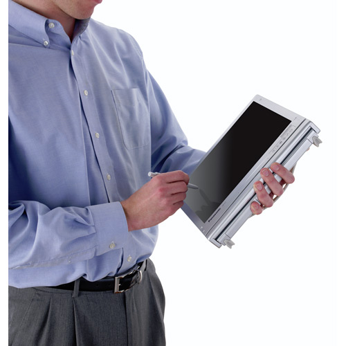 La pantalla táctil se puede usar de forma sencilla tanto en modo portátil como tablet, gracias a un sistema reforzado de triple bisagra que mantiene la pantalla rígida mientras el usuario lo utiliza. También ofrece hasta 12 horas de autonomía, gracias a sus baterías intercambiables en caliente. Con una batería de 4 celdas instalada, la unidad resulta extremadamente ligera con un peso de 1,49 kg (y de sólo 1,69 kg con las dos baterías) y su correa ergonómica permite a los usuarios sujetar el equipo con una mano y escribir con la otra.