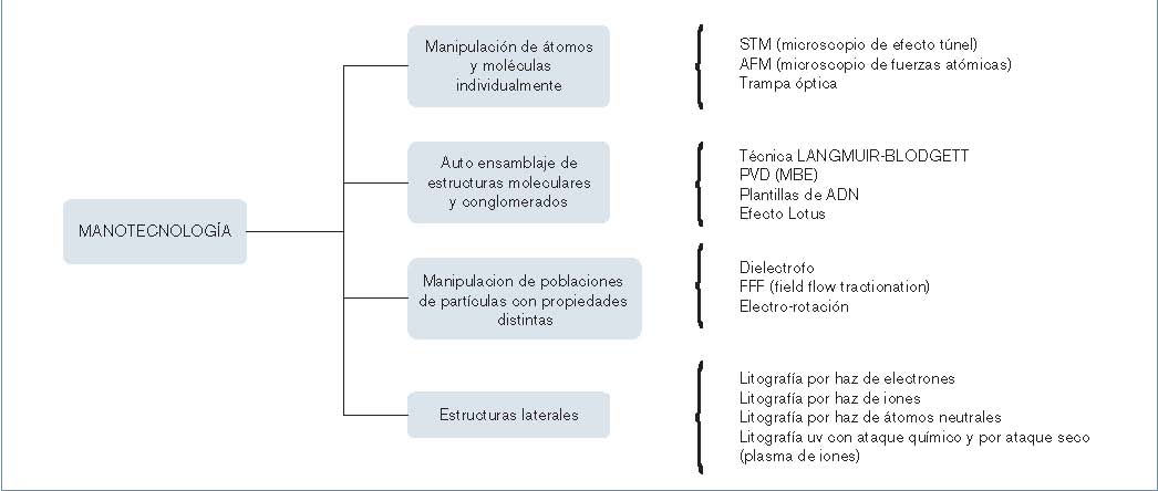 Además de estos métodos o aproximaciones globales de manipulación y procesado de las nanopartículas, se pueden incluir un sinfín de técnicas que permiten un uso más específico de los medios que proporciona la nanotecnología, como queda recogido en la figura 4.