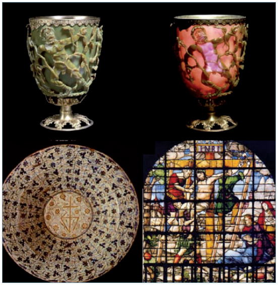 a) Copa de Licurgo (siglo IV). Presenta un color verde con luz reflejada y uno rojo rubí con luz transmitida. Esto se debe a la presencia de nanopartículas de una aleación de oro y plata en el vidrio.