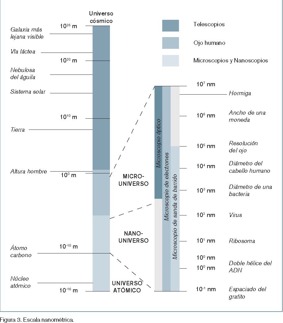 El desarrollo de las tecnologías se ha centrado desde su inicio en la búsqueda de soluciones en la dimensión macroscópica, realización de grandes sistemas técnicos a través de la macroingeniería, y microscópica, orientada a la creación de sistemas en pequeña escala, e incluso a la obtención de soluciones macroscópicas desde el conocimiento del ámbito de la microingeniería (figura 1).