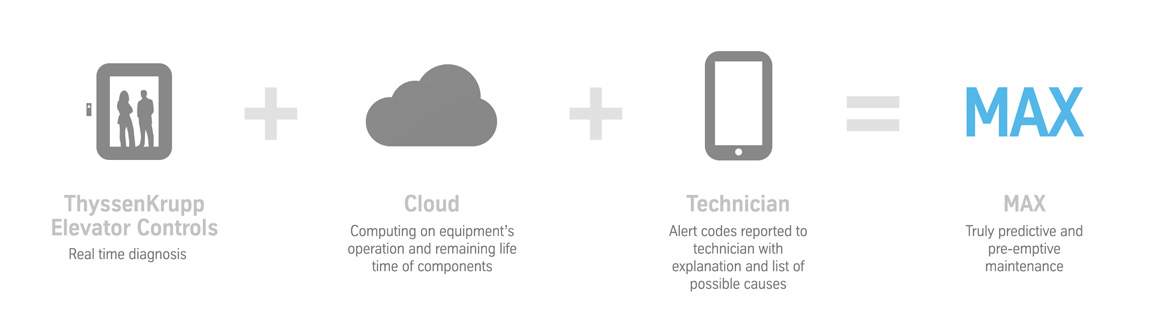Con el uso de la tecnología de Microsoft Azure Internet of Things (IoT), la innovadora solución tecnológica MAX hace posible que un ascensor «cuente» a los técnicos cuáles son sus necesidades, identifique en tiempo real las reparaciones y la sustitución de componentes y realice un mantenimiento proactivo del sistema. Con MAX, se envían los datos recogidos en tiempo real de los millones de ascensores de ThyssenKrupp conectados a la plataforma segura en la nube Azure de Microsoft, donde un algoritmo calcula el tiempo restante de vida de los principales sistemas y componentes de cada ascensor.
