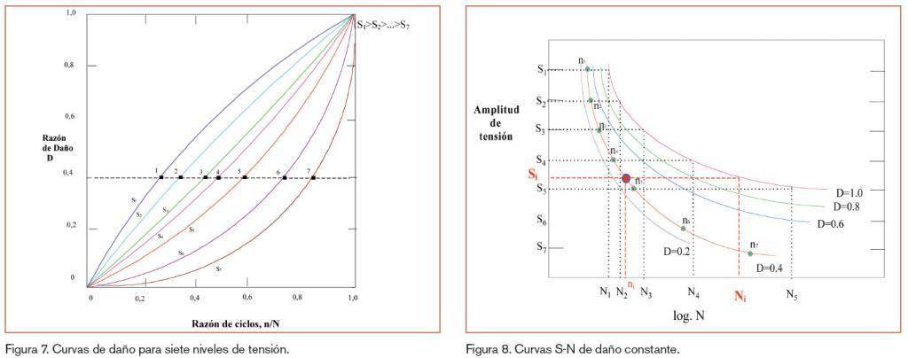 Si graficamos las curvas de daño obtenidas experimentalmente para varios niveles de tensión como se muestra en la figura 7, podemos seleccionar una línea de daño constante p.ej.: D = 0,4 cada punto (1,2,…..7) se corresponde con ese nivel de daño para las 7 curvas de diferentes niveles de tensión dibujados (S1,S2,…..S7 )
