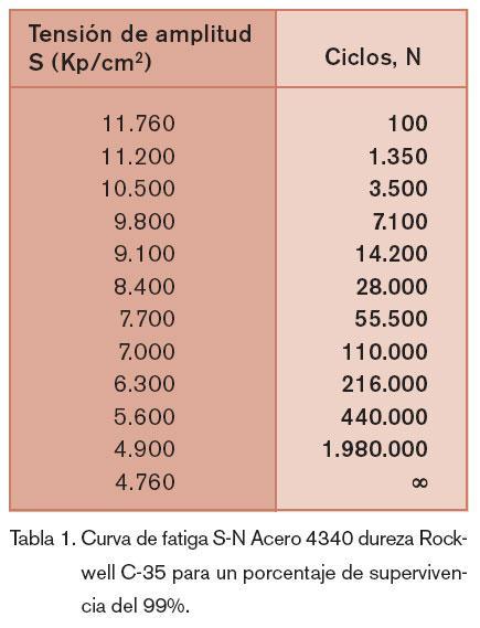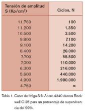 La curva S-N de fatiga para este acero sometido a cargas cíclicas totalmente invertidas se da en la tabla 1: