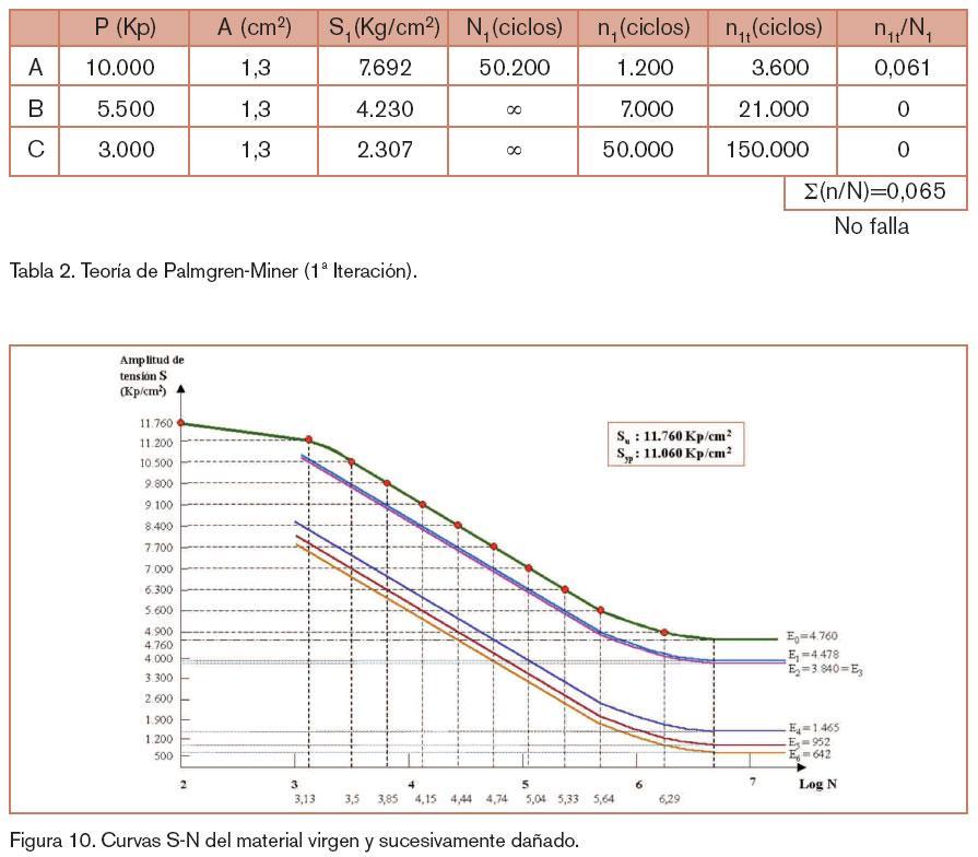 Por ejemplo: Una relación de daño D = 0,4 se obtendría según P-M con la relación de ciclos n/N = 0,4. Esta relación de ciclos produciría una fracción de daño de 0,78 bajo las condiciones de carga de la curva 1 y una fracción de daño de 0,08 bajo las condiciones de carga de la curva 3.