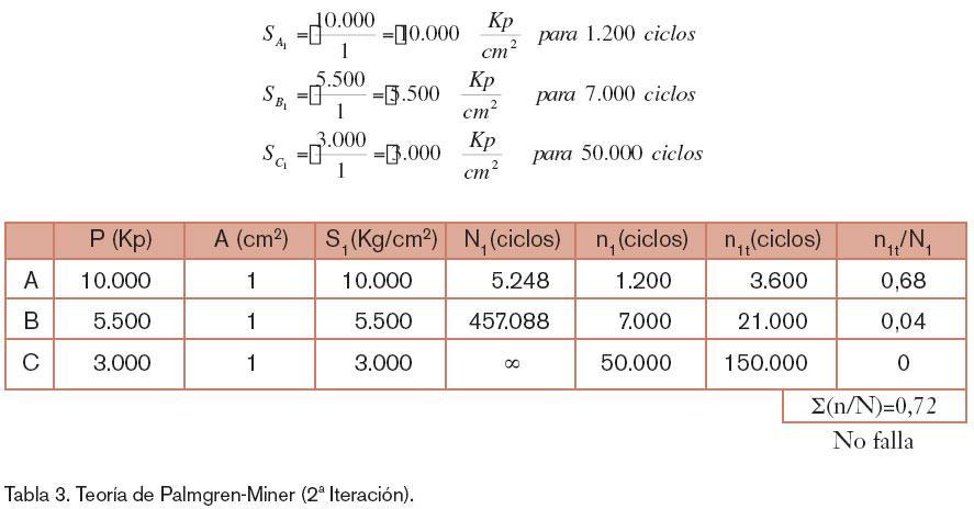 El fallo se ha producido en el primer nivel de cargas del tercer bloque, por realizar sólo 107 ciclos de los 1.200 que debería hacer. Lógicamente habría que aumentar el área para que en el nivel de carga C del tercer bloque, N valga 50.000 que son los ciclos que tendría que realizar dando n/N = 1