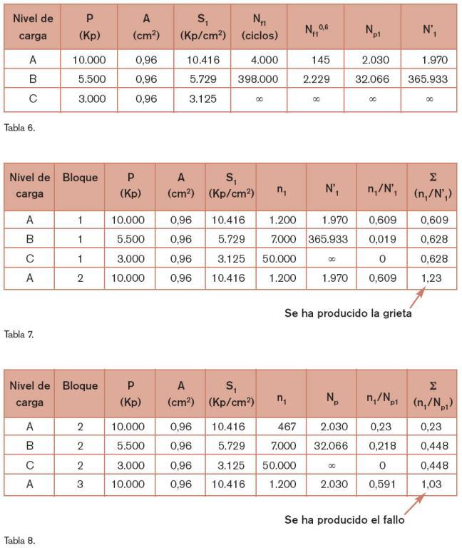 Observamos que bajo el Nivel de car-gas A, serían necesarios 4.000 ciclos para alcanzar el fallo, de los cuales 2.030 serían de propagación de grieta, por lo que para incubarse la grieta hubieran sido necesarios 4.000-2.030 = 1.970 ciclos. Como bajo este estado de carga inicialmente sólo debe realizar 1.200 ciclos quiere decir que empezará con el segundo nivel de cargas sin haberse incubado la grieta.