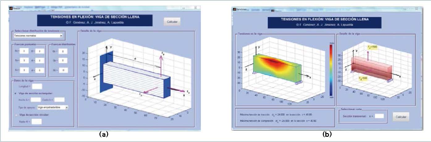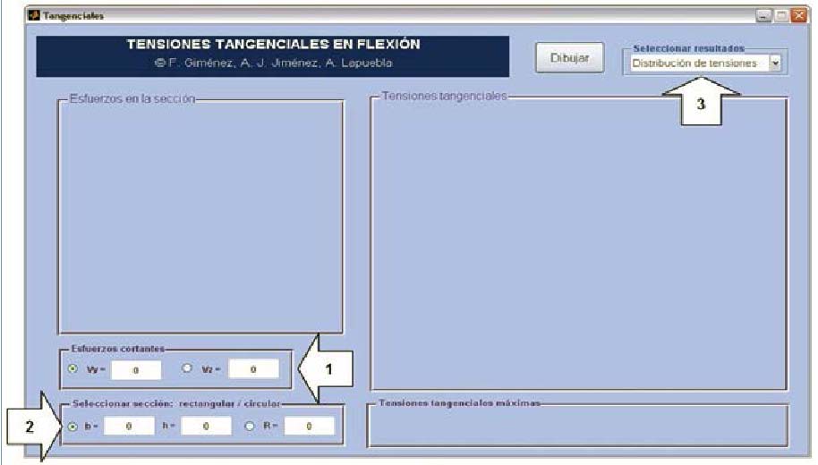 En la figura 1 se ilustra un ejemplo de la GUI de uno de los laboratorios virtuales creados por los autores, y es lo primero que contempla el usuario justo después de abrir el laboratorio virtual. Existen varias formas de introducir los datos de entrada. En los campos señalados con las etiquetas 1 y 2, se selecciona una opción entre las existentes mediante un botón de selección y se introducen datos a través del teclado; en el campo 3, la lista desplegable permite seleccionar el tipo de resultado que visualizar. Los restantes campos permanecen en blanco hasta que muestran los resultados (en este caso, distribuciones de tensiones tangenciales [véase la Fig. 2]).