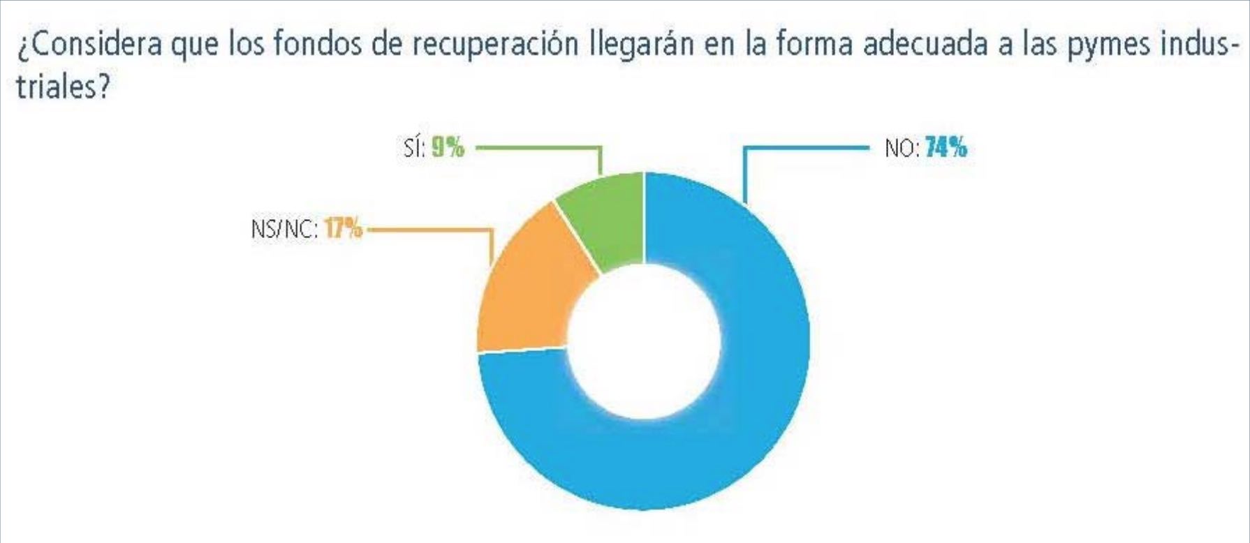 A ello hay que añadir que el 74% de los ingenieros encuestados es de la opinión de que los Fondos de Recuperación no llegarán de forma adecuada a las pymes industriales, mientras que tan solo un 9% piensa que sí lo harán, y el 17% restante no tiene una opinión definida (ns/nc).