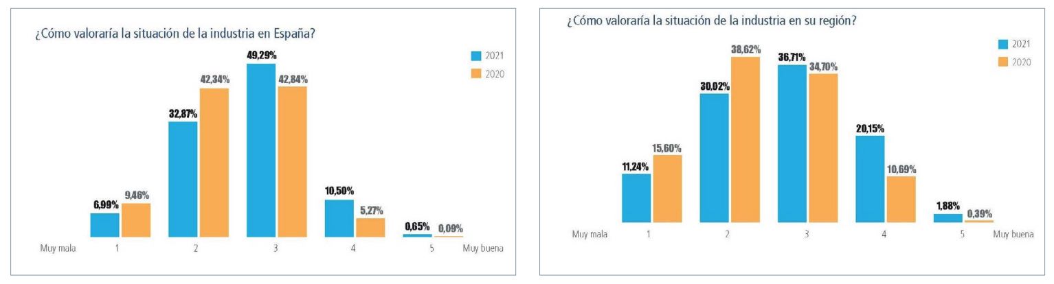 Con respecto a la situación actual de la industria en España, la respuesta mayoritaria, corresponde a la escala intermedia, con un 49,29%, mientras que casi el 40% considera que es mala o muy mala, frente al 11 % que opina que es buena o muy buena. En general, estas respuestas son más positivas que en 2020, cuando tan solo el 5,36% de los encuestados marcó esta opción de buena o muy buena, el 42,84% se decantó por la intermedia, y el 51,8% restante optó por las respuestas de mala o muy mala.